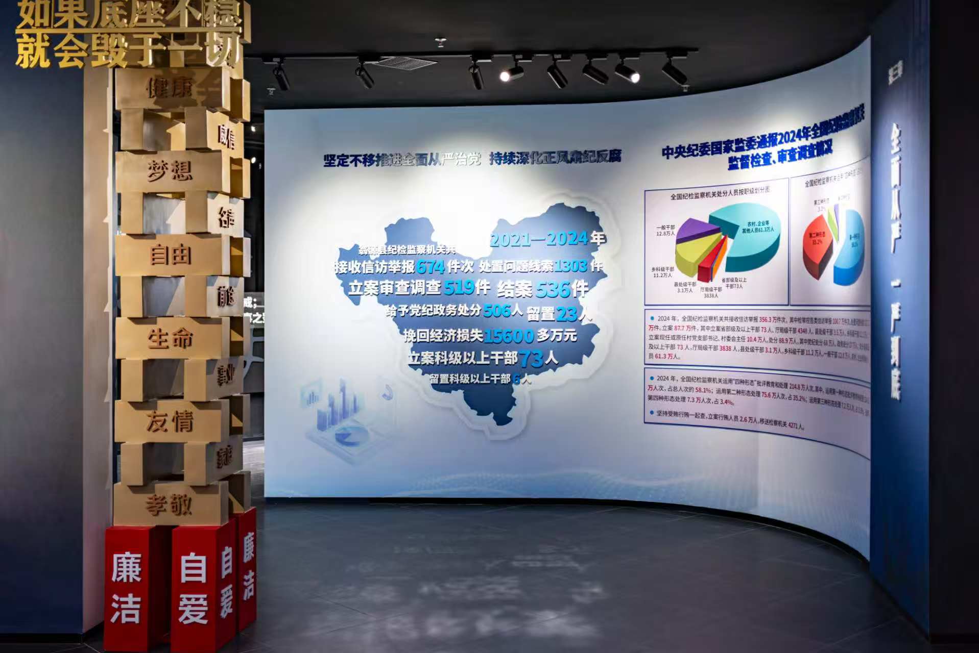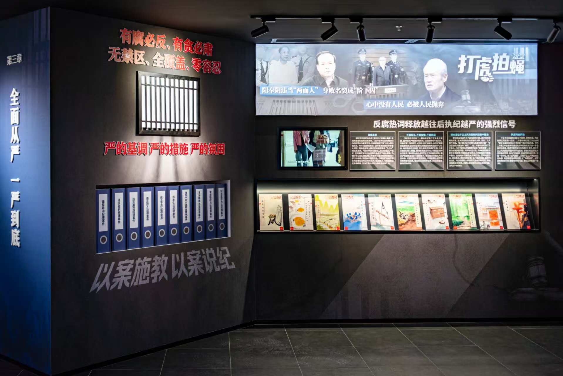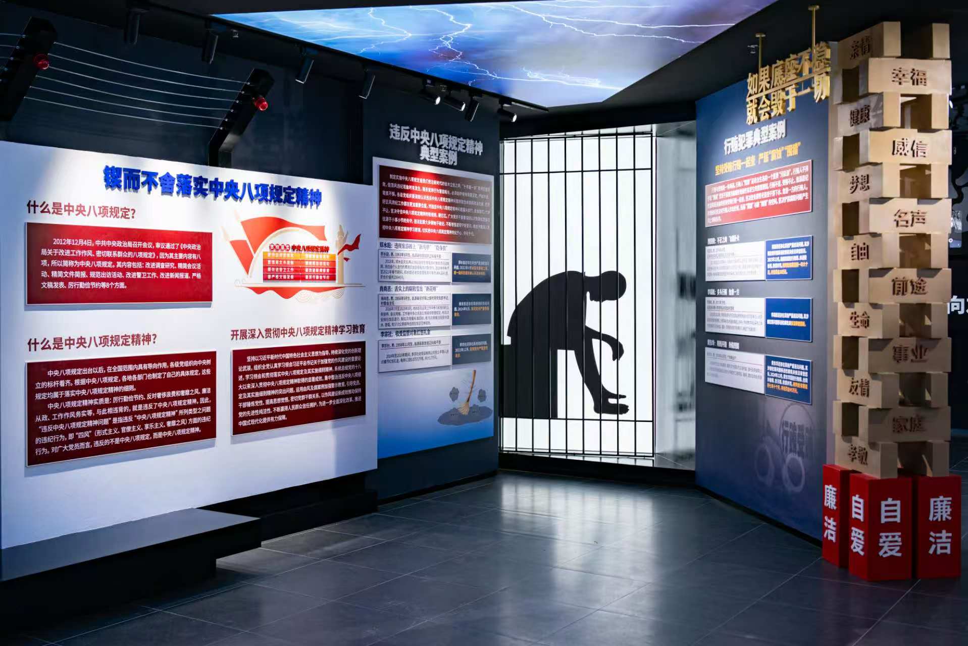 反面展厅设有正风反腐、警钟长鸣、纪法严明等三个展区,旨在以案施教,以案说纪,警示广大党员干部以纪为纲、以法为界,守住底线、不越红线、不碰高压线,自觉抵制腐败、杜绝腐败、远离腐败。