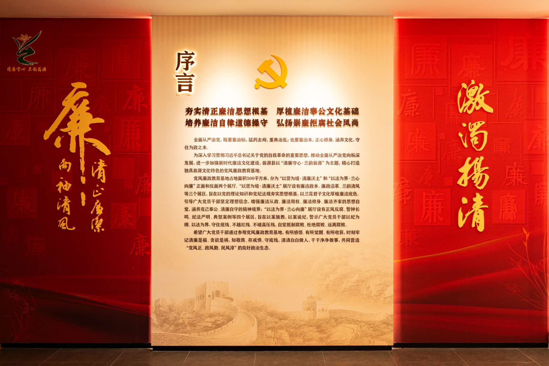 翁源县党风廉政教育基地位于中国兰花技能培训学院综合楼三楼,占地面积500平方米,是一个集理想信念教育、纪法教育、警示教育为一体的廉政主题展馆。