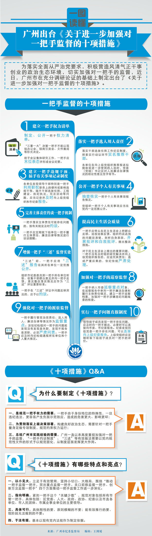 “一把手个人有关事项应当在党内一定范围公开,主动接受监督”、“抽查核实一把手个人有关事项报告情况”……为落实全面从严治党要求,积极营造风清气正干事创业的政治生态环境,加强对一把手的监督,近日,广州市出台了《关于进一步加强对一把手监督的十项措施》,上述内容即来自这一制度。该制度以十个方面措施进一步规范和约束一把手权力运行,规范对象包括各区党委、人大、政府、政协、纪委以及市直各单位、市人民团体、市属企事业单位的主要领导。(广州市纪委)[来源:南粤清风网 日期:2017-03-20 ]