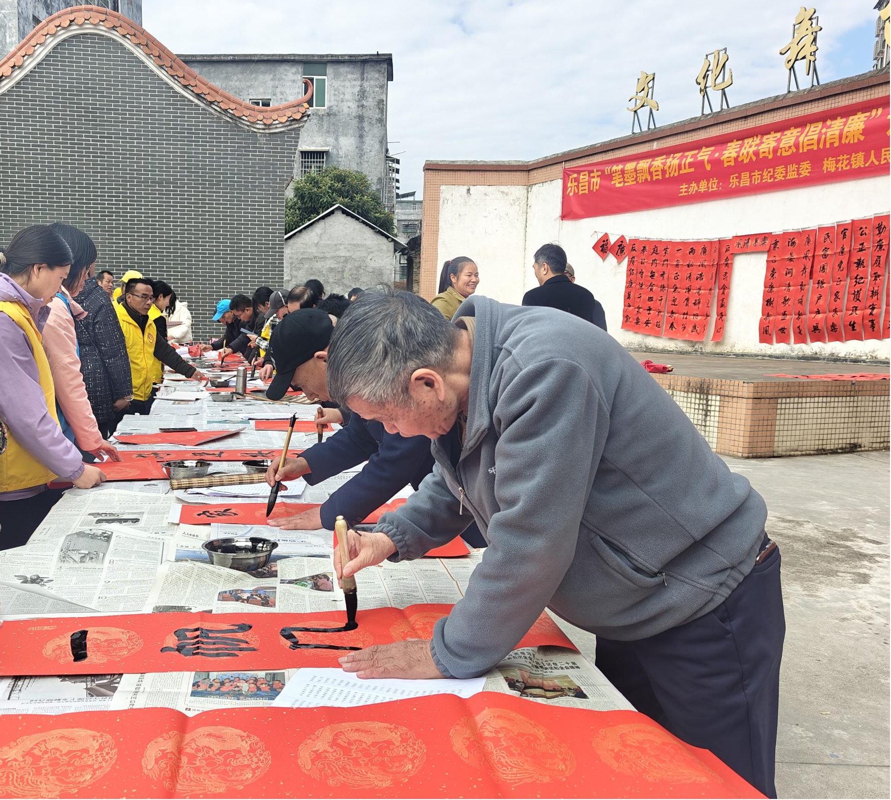 “清风满院春常在,廉洁盈心福自来”“家添如意千般喜,门纳清风百事兴”,腊月逢墟,多名书法家和少年书法爱好者齐聚乐昌市梅花镇街头,凝神挥毫、落笔生花,写下一幅幅寓意深远的春联。