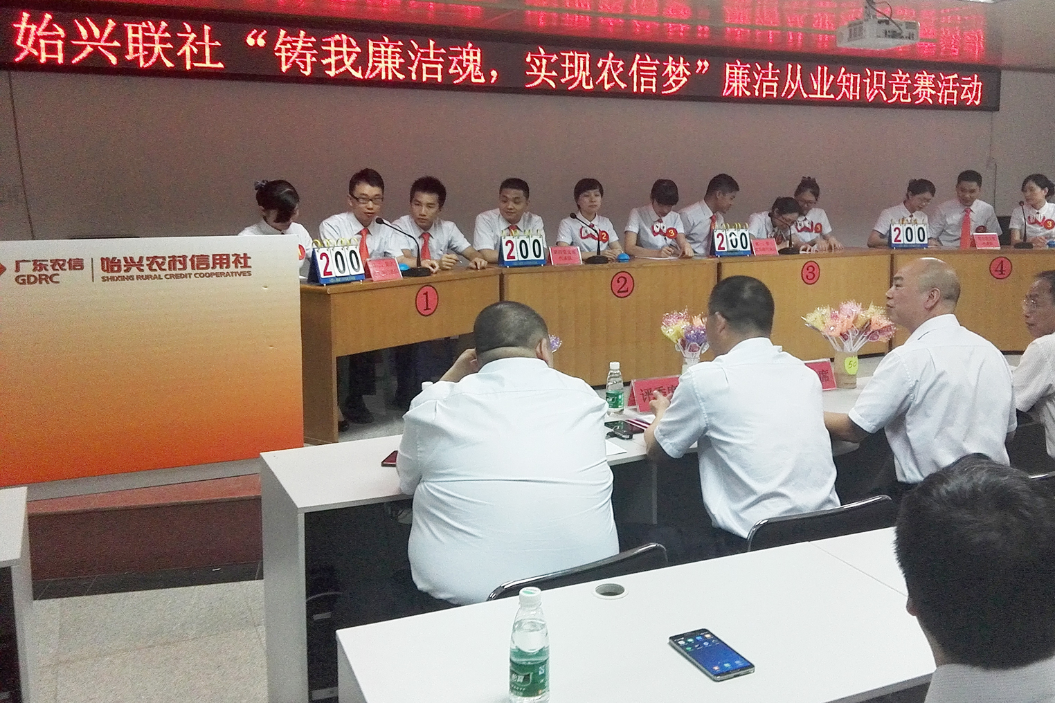 5月14日晚,始兴县农村信用联社举办“铸我廉洁魂,实现农信梦”廉洁从业知识竞赛。此次活动由联社党委主办,联社工会和团支部协办,竞赛采用团体赛的形式,共 4支参赛队伍12名参赛人员参与竞赛。各网点负责人、亲友团及机关部室全体人员观摩了竞赛。