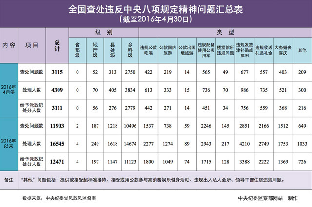 为掌握全国贯彻落实中央八项规定精神情况,中央纪委在31个省区市和新疆生产建设兵团、139个中央和国家机关、106个中央企业、15个中央金融企业建立了落实中央八项规定精神情况月报制度。2016年以来,截至4月30日,全国查处违反中央八项规定精神问题情况如下: