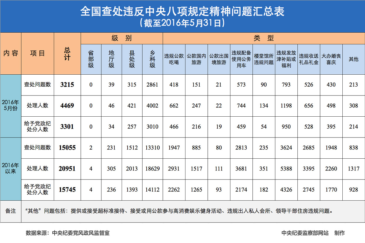为掌握全国贯彻落实中央八项规定精神情况,中央纪委在31个省区市和新疆生产建设兵团、139个中央和国家机关、106个中央企业、15个中央金融企业建立了落实中央八项规定精神情况月报制度。2016年以来,截至5月31日,全国查处违反中央八项规定精神问题情况如下: