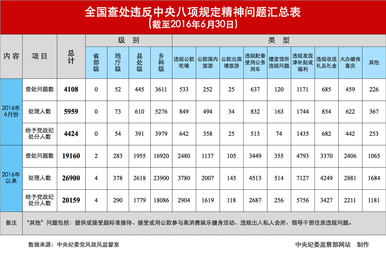 为掌握全国贯彻落实中央八项规定精神情况,中央纪委在31个省区市和新疆生产建设兵团、139个中央和国家机关、106个中央企业、15个中央金融企业建立了落实中央八项规定精神情况月报制度。2016年以来,截至6月30日,全国查处违反中央八项规定精神问题情况如下: