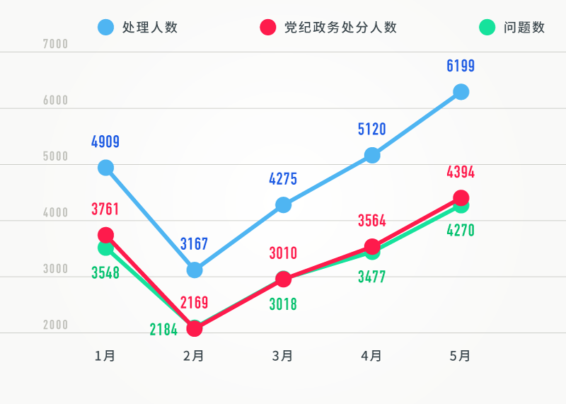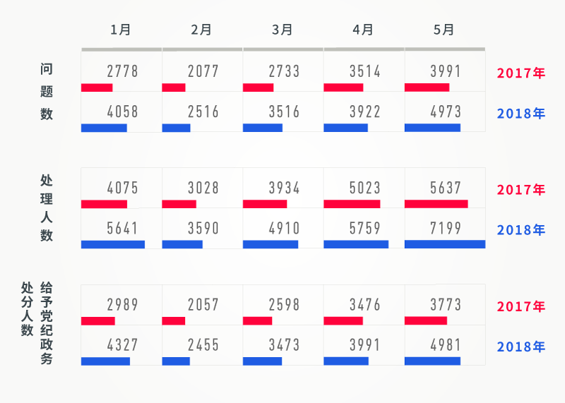 仔细梳理发现,今年1-5月,每月全国查处违反中央八项规定精神问题数、处理人数、给予党纪政务处分人数相比去年同期均大幅上升。此外,除2月有下降外,1-5月的各项数据呈逐月攀升趋势。