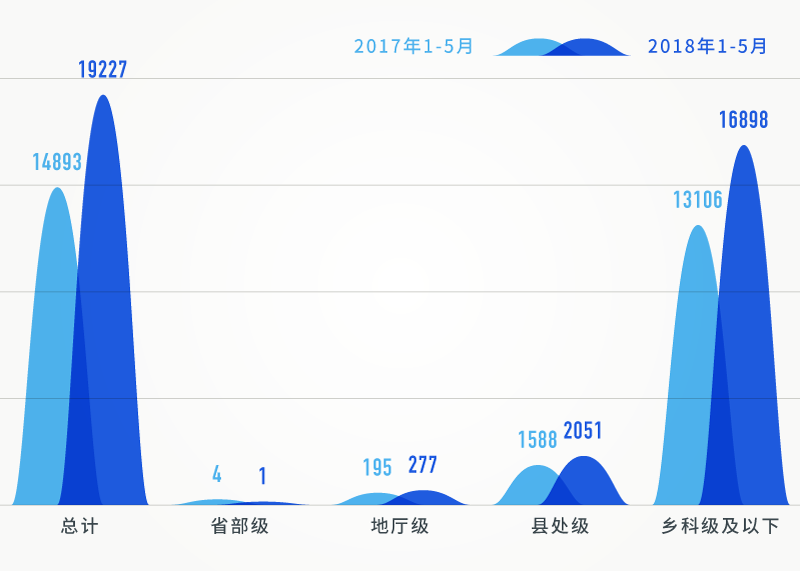 在给予党政纪处分人数中,除省部级干部人数降低了以外,地厅级、县处级、乡科级及以下人数相比同期均大幅提升。特别是,今年1-5月,给予乡科级及以下人员党纪政务处分达16898人,相比同期增长28.9%,且占到了处分总人数的87.9%。反映出全面从严治党不断向基层延伸,持续加大查处群众身边的“四风”和腐败问题力度。