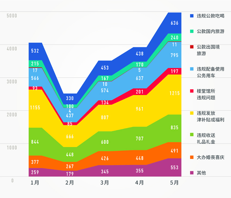 再来看,违反中央八项规定精神问题类型。从1至5月各类查处问题的面积分布图来看,各类具体问题的查处趋势也保持了较稳定的增长态势。值得注意的是,违规发放津补贴或福利、违规收送礼品礼金、违规配备使用公务用车、违规公款吃喝、大办婚丧喜庆等问题类型,相比同期仍是所有问题类型的“大头”(占据前5名),占比仍超80%。数据显示,这些老问题,仍需下大气力纠治,持之以恒,久久为功。