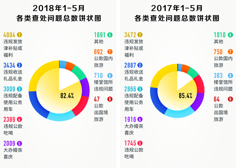2017年、2018年1-5月各类查处问题总数饼状图,违规发放津补贴或福利、违规收送礼品礼金、违规配备使用公务用车、违规公款吃喝、大办婚丧喜庆等“老问题”占比较大,均超80%