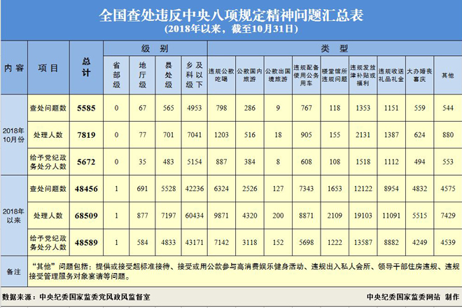 今年以来,截至2018年10月31日,全国查处违反中央八项规定精神问题48456起,处理68509人,给予党纪政务处分48589人。