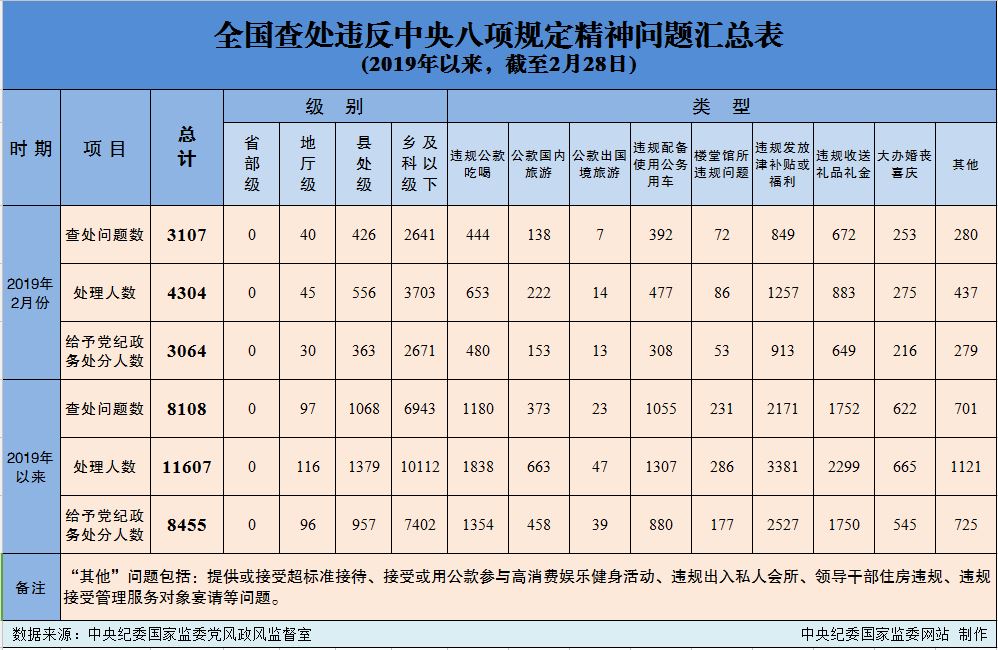 为掌握全国贯彻落实中央八项规定精神情况,中央纪委在各省区市和新疆生产建设兵团、各中央和国家机关、各中央企业和中央金融企业等建立了落实中央八项规定精神情况月报制度。2019年以来,截至2月28日,全国查处违反中央八项规定精神问题情况如下:
