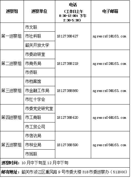 十二届韶关市委第六轮巡察各巡察组进驻情况一览表