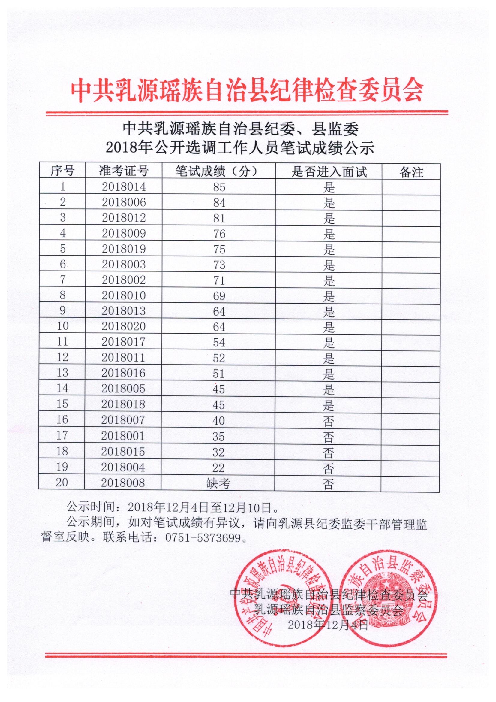 中共乳源瑶族自治县纪委、县监委2018年公开选调工作人员笔试成绩公示