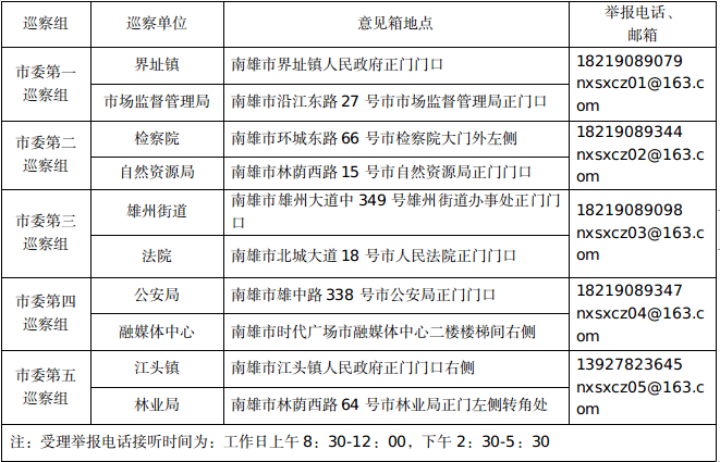 十四届南雄市委第八轮常规巡察各巡察组联系方式一览表